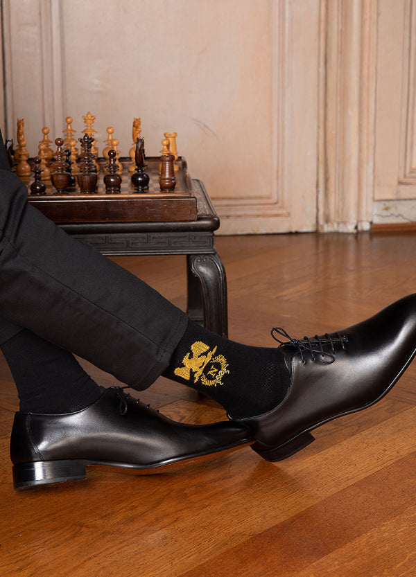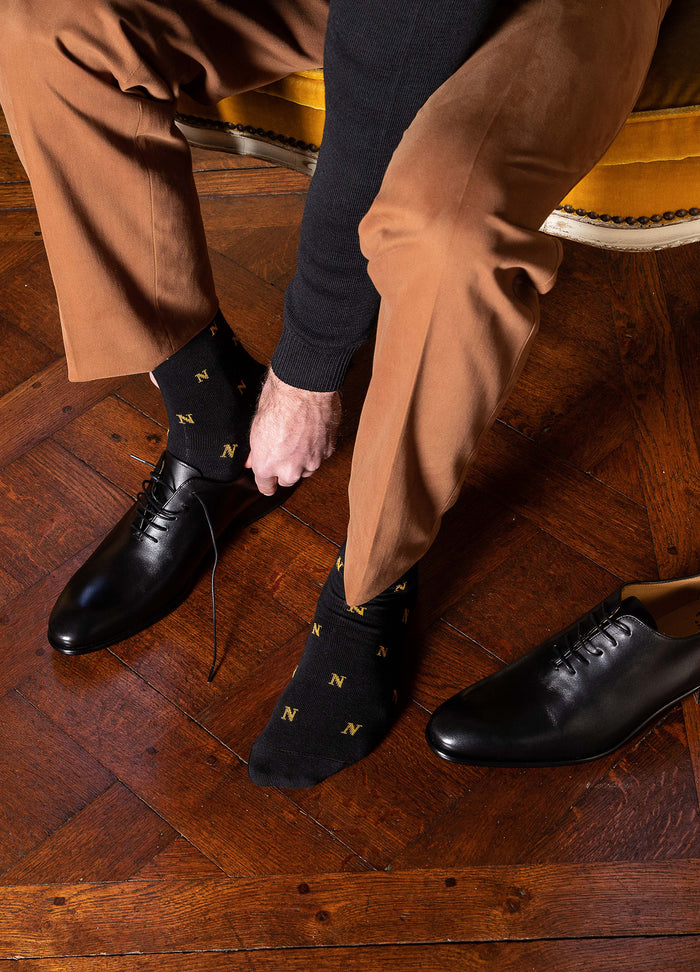homme assis dans un fauteuil, portant un pull napoléon noir et une paire de chaussettes Napoléon noires Maison Broussaud